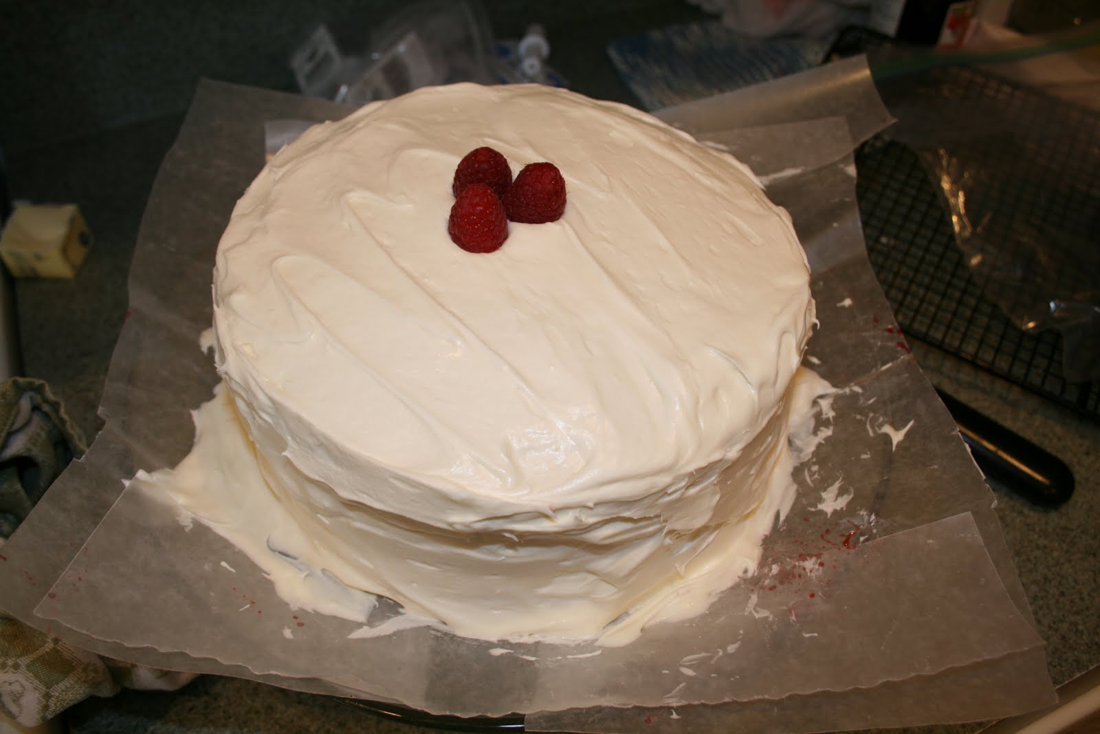 Since I was short on time I stuck them in the freezer to cool completely. After they were cool I added a thin layer of raspberry jam to one of the pink layers and then the white layer. I decided not to shave the tops to even the layers so I ended up stacking the bottom two layers top to top. Meanwhile I whipped up the white chocolate frosting. This was the third time that I thought this cake was doomed. It seemed as though the frosting was going to be way too thin but it ended up holding its form nicely.